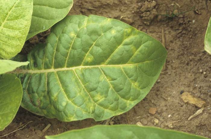 The most common parasitic disease is caused by Peronospora hyoscyami f.sp. tabacina (once considered as a fungus, now belonging to stramenopila), causal agent of tobacco mildew or "blue mould" (figure 1). Note that tobacco is very susceptible to this pathogen at all stages of its culture and its presence is characterised by a blue velvety surface developing on spots.