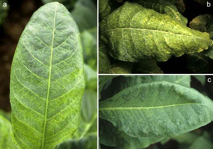 In addition to typical mosaic symptoms presented in the introduction of Leaf mosaics, other viral symptoms can be observed on tobacco (several examples by pictures):