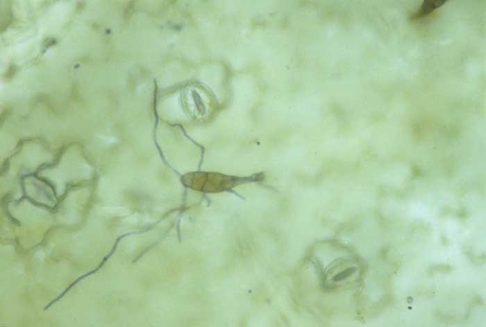 The fungus most often initially contacts the lower leaves via soil/water splash. They affect first the lower leaves. Penetration can occur in two ways: either directly through the cuticle or through stomata (figure 1) or various injuries on the leaves. The first mode seems to be the most common. Penetration is largely favoured by the presence of water on the leaves. Contaminations take place more easily on the underside of the lamina. After penetration, the fungus will gradually invade the leaf tissues. The first symptoms are visible after 5-8 days of incubation.