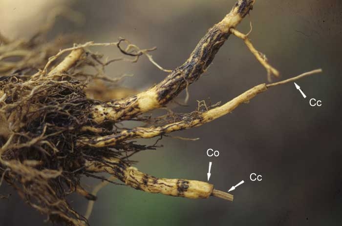 Symptoms of T. basicola on the roots are characteristic. As the name of the disease indicates, it results in browning or blackening in various degrees of the roots (figures 1 and 2). On larger roots, damage is more limited in some areas, appearing in the form of sleeves of variable aspect (figures 3 and 4). In all cases, observation with a handlens or a microscope of brown chlamydospores on and in tissues confirms the diagnosis (figure 5).