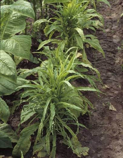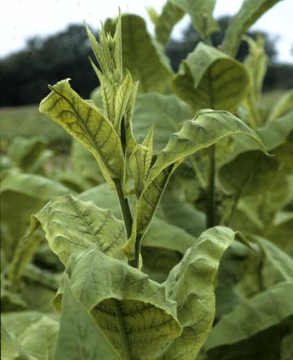 Faced with polyphylla (or "Frenching"), tobacco farmers observe both in nursery and in the field, rather special symptoms affecting mainly the leaves. First, a fairly marked yellowing of interveinal tissues. On the contrary, the veins remain very green, contrasting with the rest of the lamina. Then the growth of new leaves is particularly affected, and so is their shape. There is no radial growth of leaves, and ultimately they are very slender (figure 1), with the tip curled down and wavy edges (figure 2). Many developing axillary buds give rise to a rosette of numerous, small, narrow and light green leaves (hence the name polyphylla) thus giving the plant a rather characteristic witches broom appearance (figure 3).