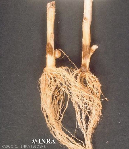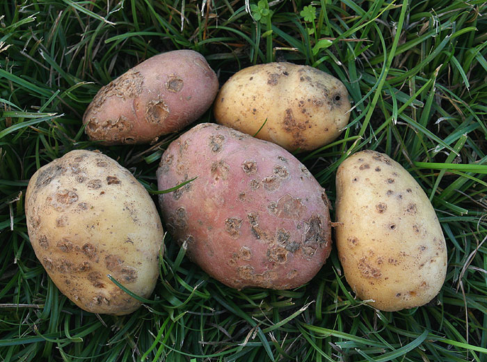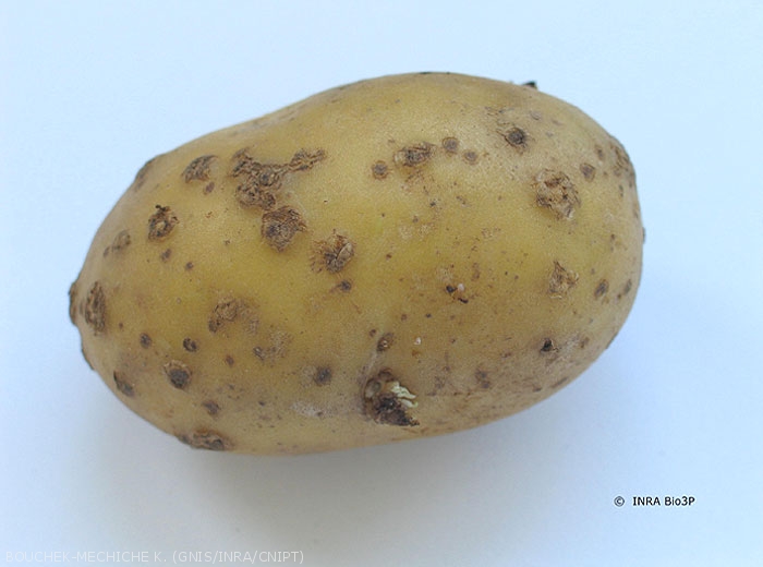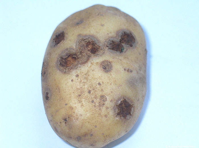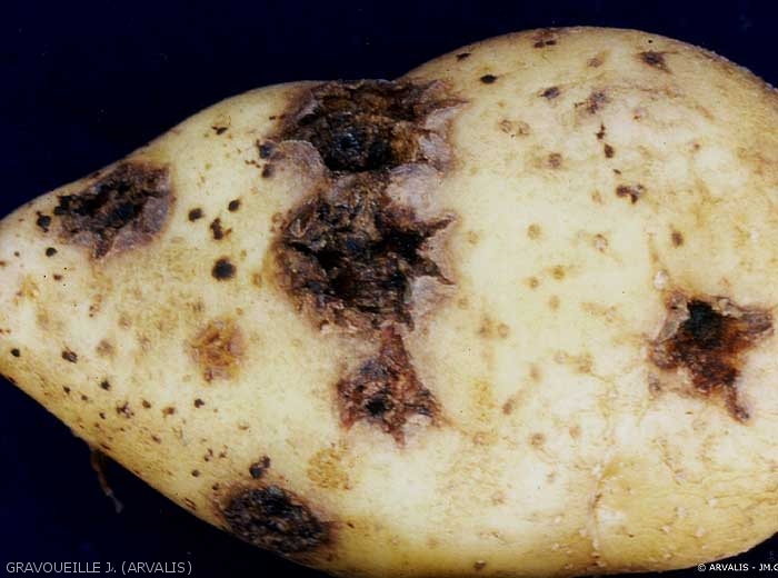 On susceptible potato cultivars, the lesions form craters (photo 1) in the tubers (photo 2 to 4) and necrosis may be observed on the stem base (photo 5) and on the stolons. On other varieties, attacks may be superficial corky lesions on the tuber surface (photo 6) or star-like corky lesions (photo 7).