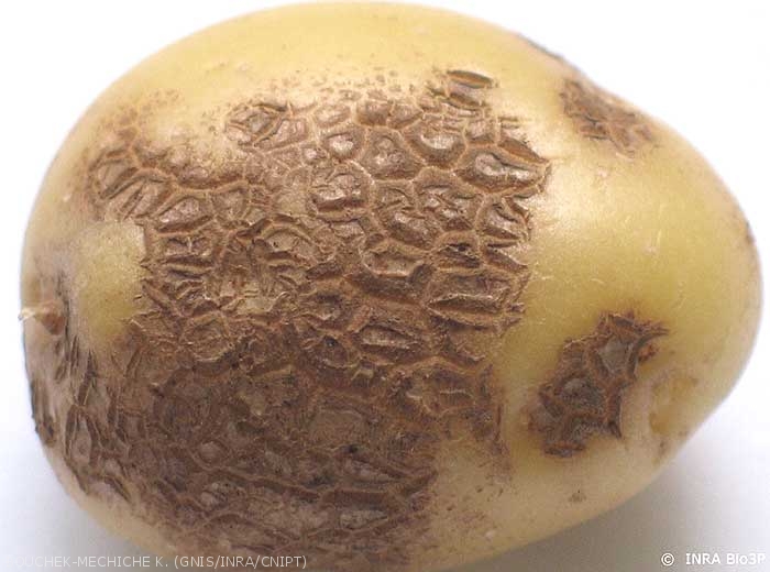 - Netted (or flat or surface) scab is characterised by corky spots that usually coalesce to form a network of polygonal corky lesions on the tuber surface (photos 8 and 9). Necrosis on the stolons and on roots and a reduction of root system (photo 10) may also be observed on highly susceptible cultivars.