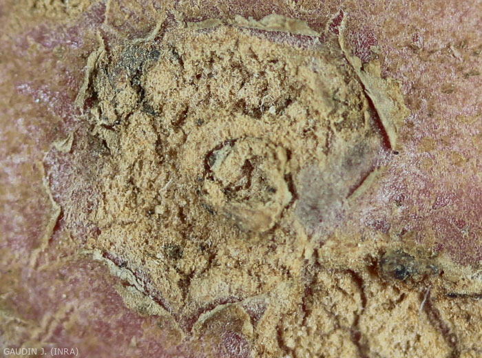 - Common scab characterised by shallow or deep-pitted corky lesions (pustules) which depend on various factors, including the type of strain, the cultivar and the climatic conditions.