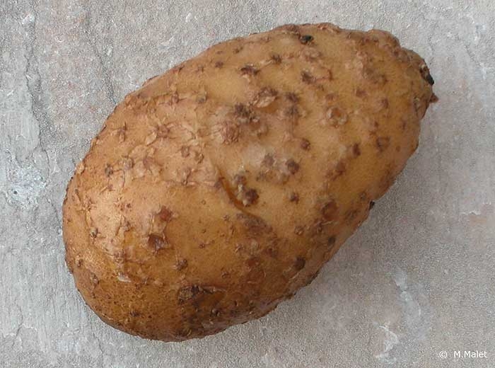 In roots, galls (photo 1) form, usually of irregular size, as an obvious proliferation of root tissues. Galls keep their whitish colour unlike powdery scab galls, which are initially white at harvest and then turn black after oxidation.
