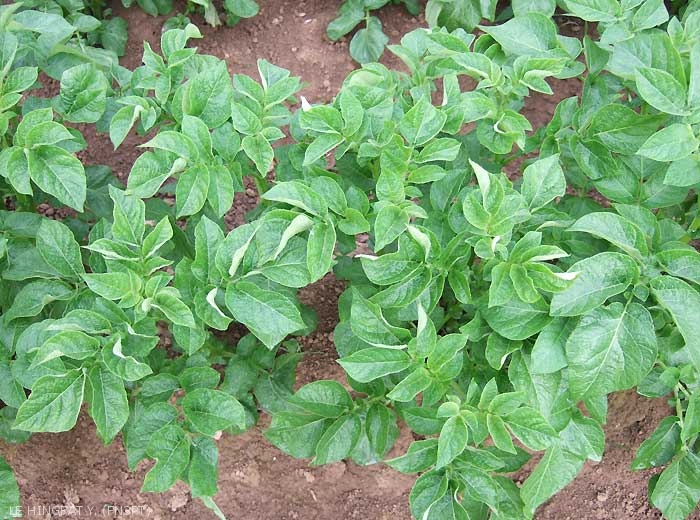 Typical symptoms of PVM have been called paracrinkle or potato leaf rolling mosaic as they have the appearance of rolling in the top of the plants (photo 1) with mild mosaic and ”spoon-shaped” rolled leaflets. Leaf rolling due to PVM is soft when touched whereas Potato leaf roll virus induces a «cracking» leaf rolling. It occurs in developed plants, usually on the top leaflets.