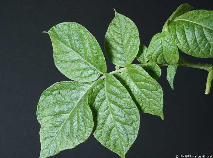 Typical symptoms of PVM have been called paracrinkle or potato leaf rolling mosaic as they have the appearance of rolling in the top of the plants (photo 1) with mild mosaic and ”spoon-shaped” rolled leaflets. Leaf rolling due to PVM is soft when touched whereas Potato leaf roll virus induces a «cracking» leaf rolling. It occurs in developed plants, usually on the top leaflets.