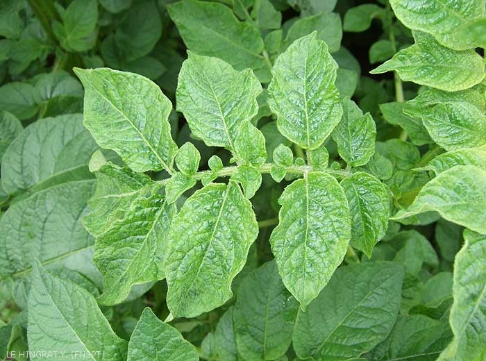 - mosaic pattern or mottling : alternating patches of light green and dark green areas without any leaf distortion, more or less visible depending on the potato cultivar and the climate (usually more visible in overcast weather) (photos 9 to 11).