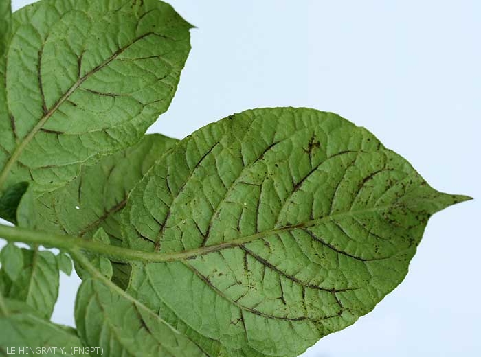 Field infection during the current-season with PVYO isolates (primary infection) results in symptoms of vein necrosis and necrotic spots on the underside of the leaflets (photo 1). The leaves become brittle and dry, but remain attached to the plant (so-called leaf-drop symptom). Primary infection can also produce a distorting mosaic symptom and crinkling, often confined to one stem or one part of the plant.