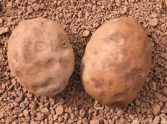 The symptoms appear when the plants are getting warm again after frost. The frozen part of the tuber becomes soft. The inside becomes liquid and blackens. In the case of a partial frost, irregular grey to black spots (photo 3) may be observed in the flesh but more commonly in the outer part of the tuber.