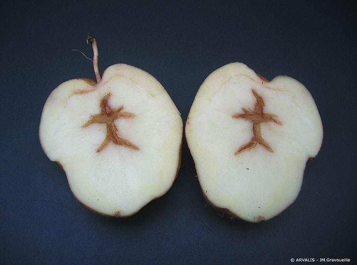 With some susceptible cultivars such as BF 15 and Russet Burbank, hollow heart is preceded by brown heart; in others, it appears alone. That is why it is likely that these different symptoms are only the varietal expression of a single physiological disorder, especially as their causes are the same.