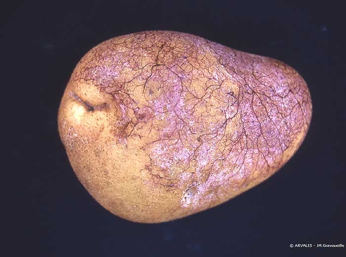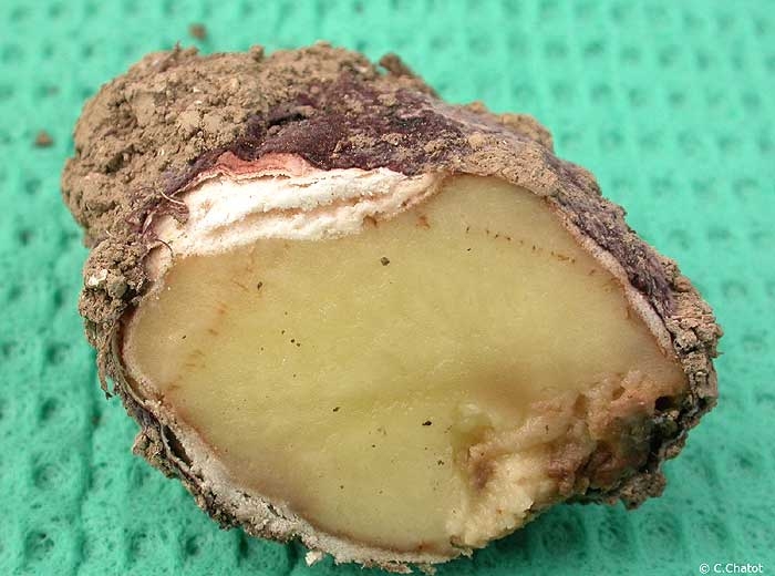 The mycelium then penetrates the tuber. The skin cracks, the flesh changes into a greyish dry rot and finally the tuber disintegrates completely (photos 6 and 7).