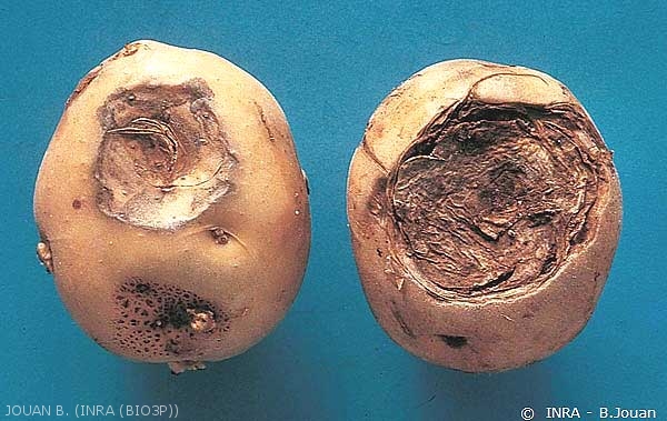 Dark depressed areas may be observed on tubers, characterised by thumb mark spots (photo 1) which are frequently found around the wounds, the eyes, the lenticels or at the heel-end.