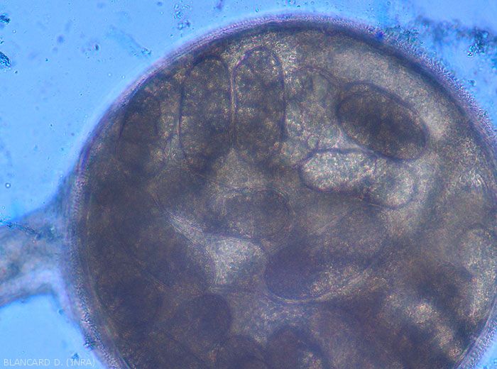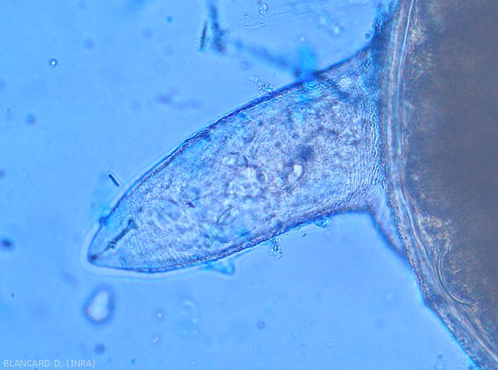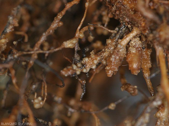 - Parasitism : The larvae penetrate the roots and migrate to the vessels through the cortex, between the cells. Induce galls surrounding large pear-shaped females which produce numerous eggs (300 to 3000, between 400 and 500 on average).