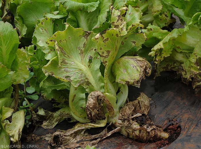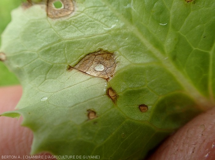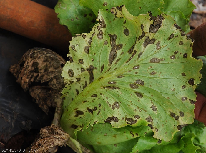 Subsequently, the spots spread and form brown lesions sometimes circumscribed by the veins.