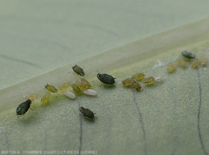 - Larvae and adults often present on the underside of the blade, feeding through their rostrum. The excess sugar contained in the sap is released in the form of honeydew.