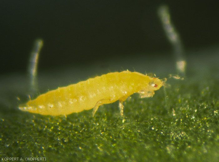 - Development cycle : comprising 6 stages: egg, two larval stages, two pronymph stages and adult; its duration varies according to the temperature and the host plant (for example, for F. occidentalis it fluctuates from 34 days at 15°C to 13 days at 30°C).