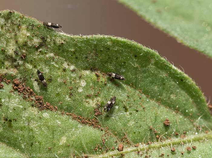 - Signs : Presence of tiny elongated insects on the affected plant organs (figures ).