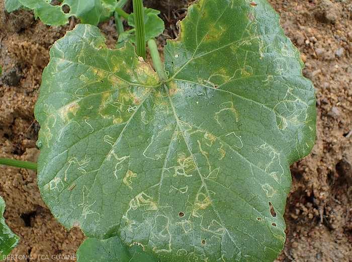- Numerous chlorotic nutritional punctures observed on the lamina and produced by the females with their ovipositor. Galleries, mines (figures) more or less sinuous appear thereafter on the leaves.