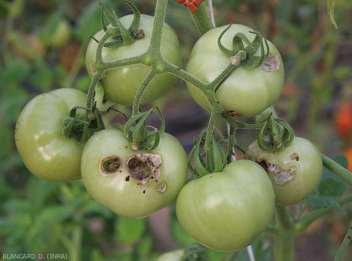 - Perforation of stems and fruits which they subsequently invade. In addition to the perforations, galleries and cavities are observed. Many droppings are visible inside and also outside. Parasitized fruits, for example tomato, stop growing, ripen prematurely and fall off. Note that these perforations facilitate the penetration of many rotting agents, such as Choanephora cucurbitacearum , etc.