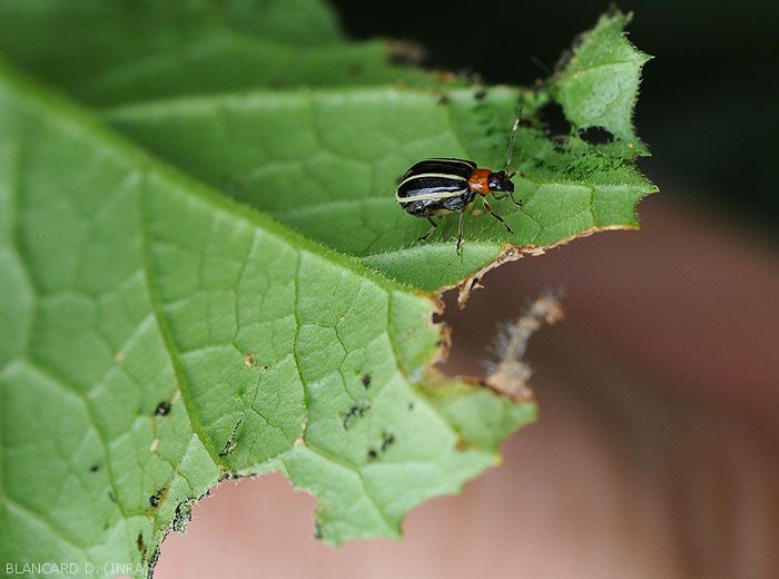- Leaves eaten mainly by adults which feed on the blade. This is cut out, holed more or less regularly, the veins sometimes remaining in place and giving the leaves the appearance of lace.