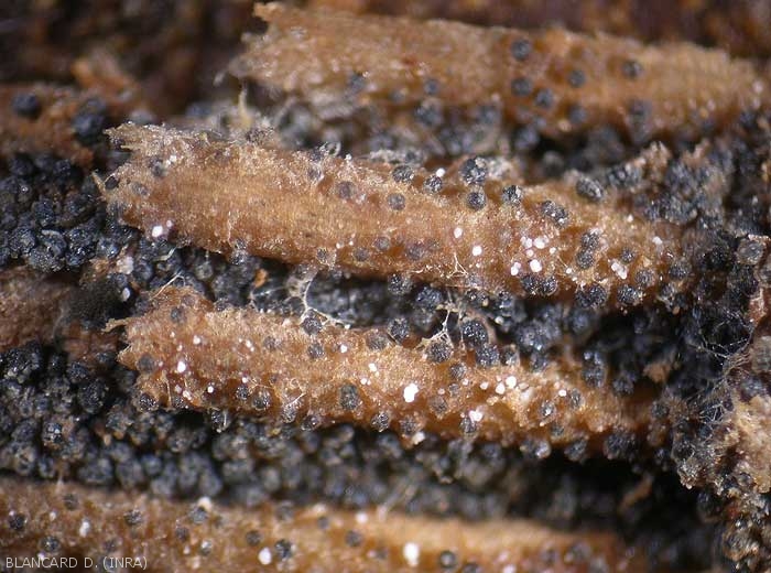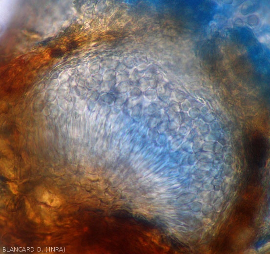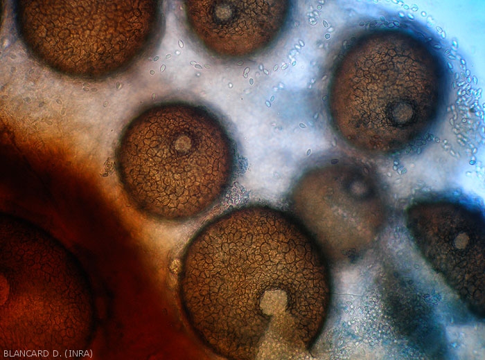 The interior of each pycnidia is lined with numerous conidiophores hyaline (figure 4) at the end of which form conidia smooth, unicellular and initially hyaline (figures 5 to 8). Elliptical to ovoid in shape (8-16 x 5-7 µm), these mix over time (Figures 9 and 10).