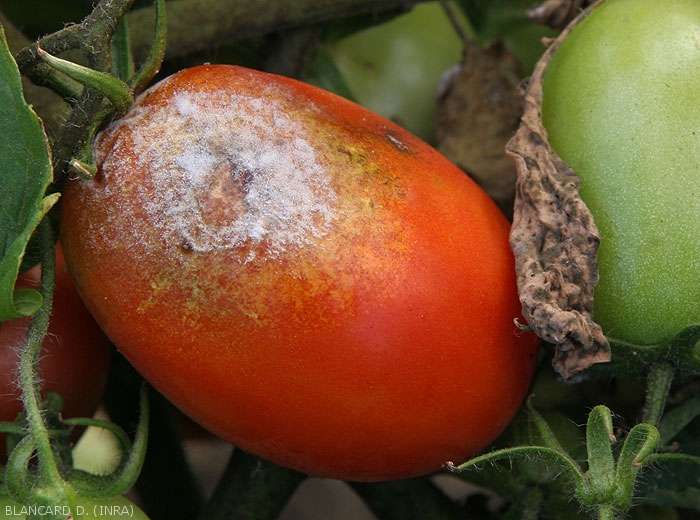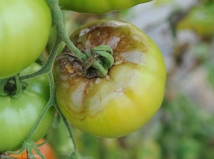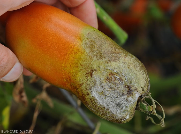 Signs : presence of a discreet and fleeting white down on the affected organs: the underside of the blade of the leaf lesions (figures 10 to 13), the stem, the fruits (figures 9 and 14); this is made up of the sporocystophores and sporocysts of P. infestans.