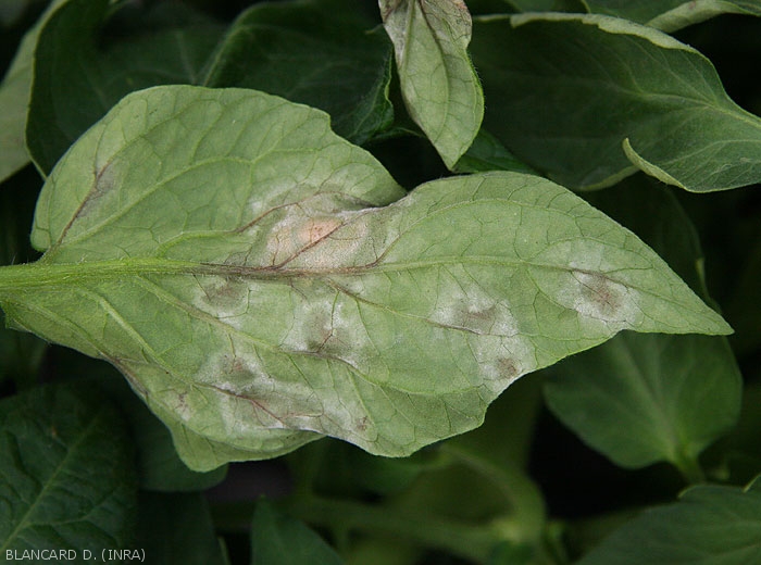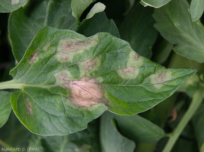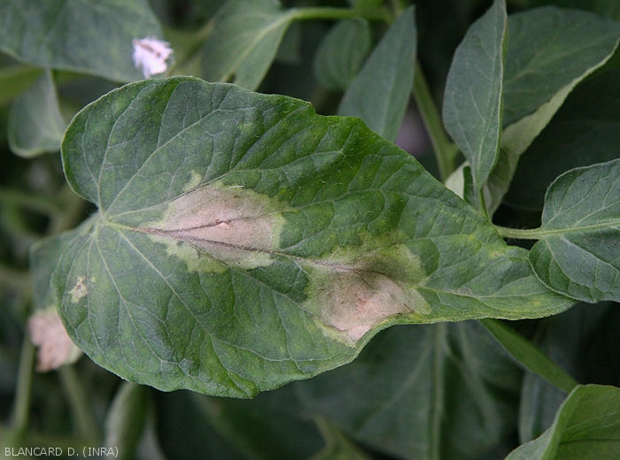 Pale green to brownish green spots on the leaflets at first wet (figure 1). These spots are frequently surrounded by a livid, ill-defined tissue margin (Figure 2).