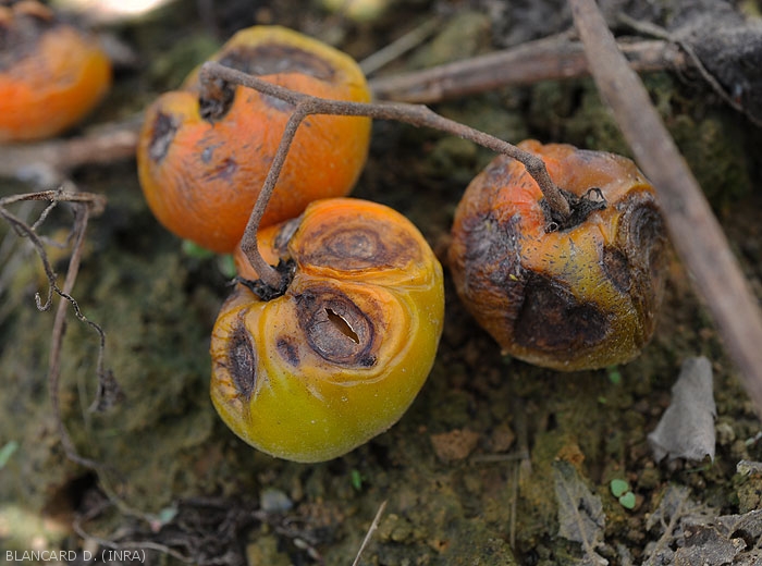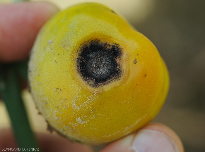 Small, moist, dull circular lesions, light brown, progressively developing on fruit. As they extend, they become concave and their center gradually browns (figures 1 to 3)