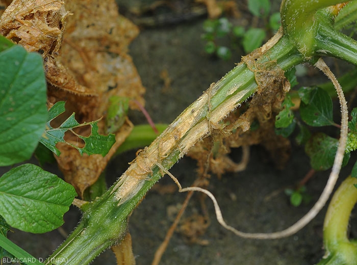Longitudinal cankerous lesions on stems and petioles, slightly depressed, beigeish in color (figure 5), sometimes with the presence of brown exudates.