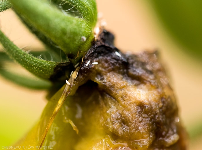 On young tomato fruits, the first attacks appear very early, about ten days after flowering, when their diameter reaches 2 cm. The attack rate then increases rapidly and reaches its maximum about 3 weeks after flowering. Subsequently, older fruits may still be punctured, albeit more weakly.