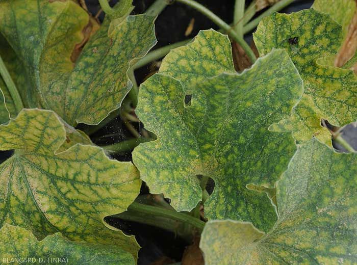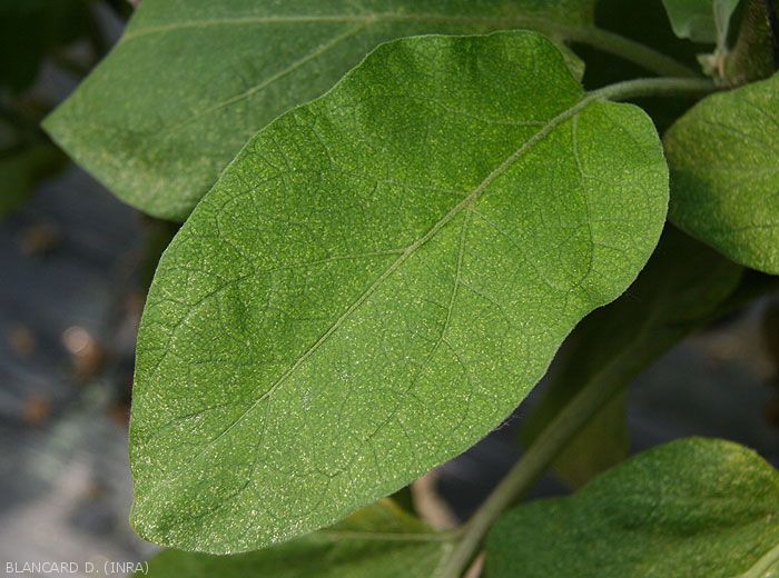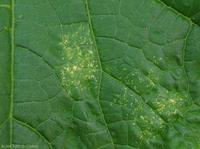 * The larvae, nymphs and adults, often present on the underside of the leaf blade, feed by biting and then sucking the contents of plant cells and are therefore responsible for these symptoms.