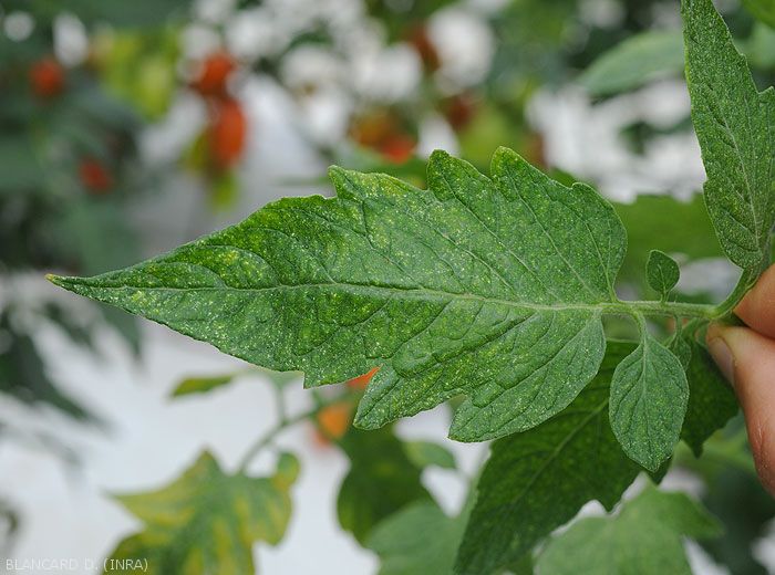 - Tiny, more or less scattered chlorotic punctiform* spots appearing on and under the leaf blades (figures 3, 6 and 7, 10 and 11, 13 to 15). The latter gradually yellows and the leaf ends up scorching, even drying out during severe attacks (figures 8 and 9, 17) .