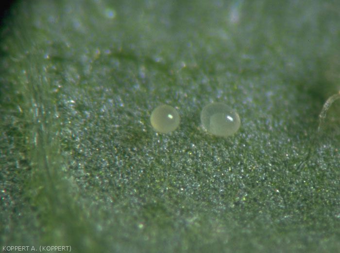 - Eggs are laid mainly on the underside of leaves. They are round, tiny (0.14 mm in diameter), translucent at first then become opaque, and eventually turn yellow as they approach hatching.