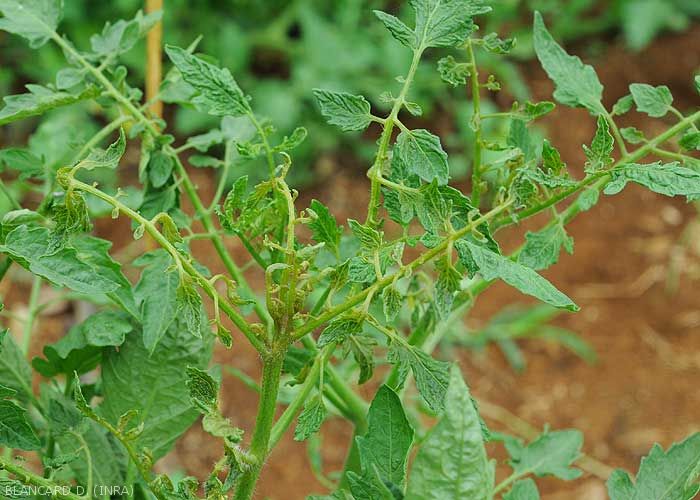 Rolling of the leaves which are also pleated, thicker and more rigid (figures 5 - pepper) (figure 10 - tomato). They sometimes have a bronze to brownish hue, and their underside has shiny reflections.