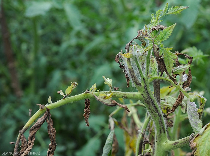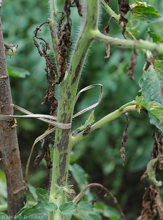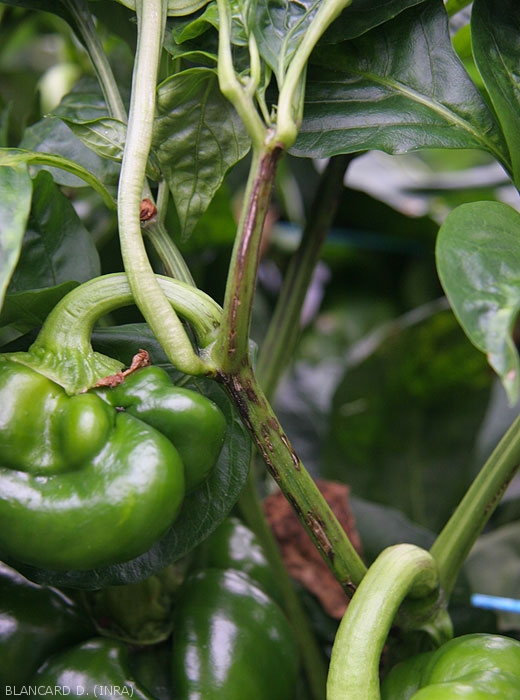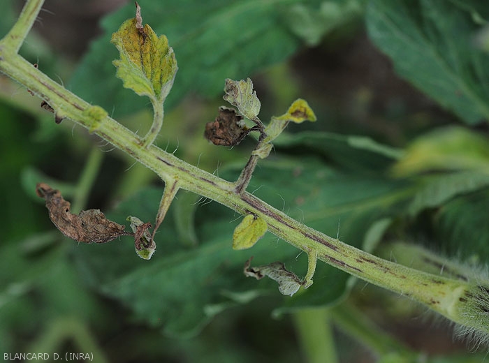 - Elongated necrotic lesions (streak) on petioles and stems (figures 8 and 9-tomato; 19-pepper).