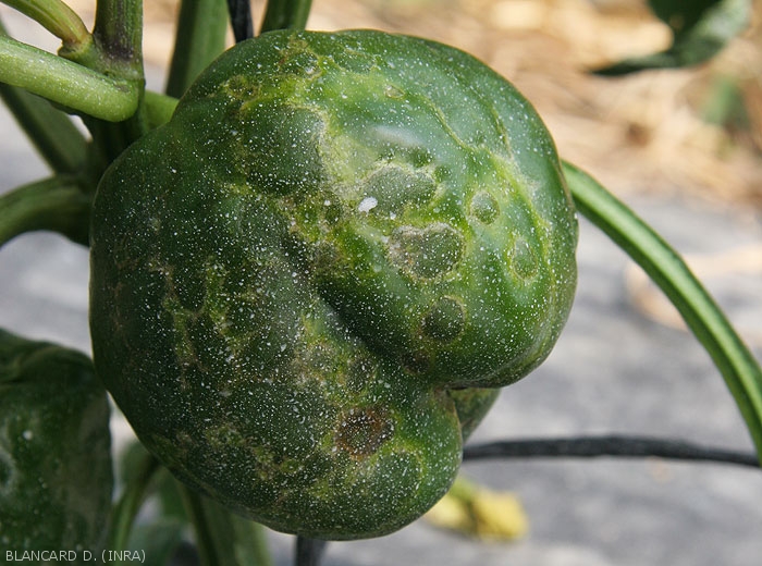 - Reduced number of fruits, which are deformed and reduced in size. Broad arabesques, sometimes concentric rings (figure 20-pepper), discolored areas sometimes tan, dry and cracked necrotic spots are also visible (figures 12-tomato;.