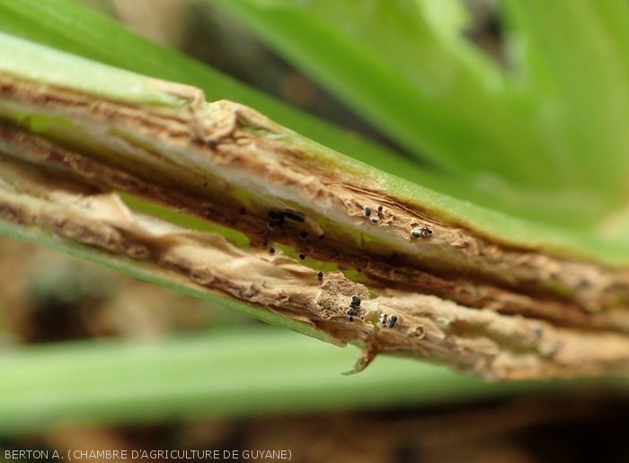 : presence of greyish to black sporiferous pads: sporodochia (figure 3). These structures are made up of numerous phialides which form at their end cylindrical conidia, hyaline to slightly olive-coloured.
