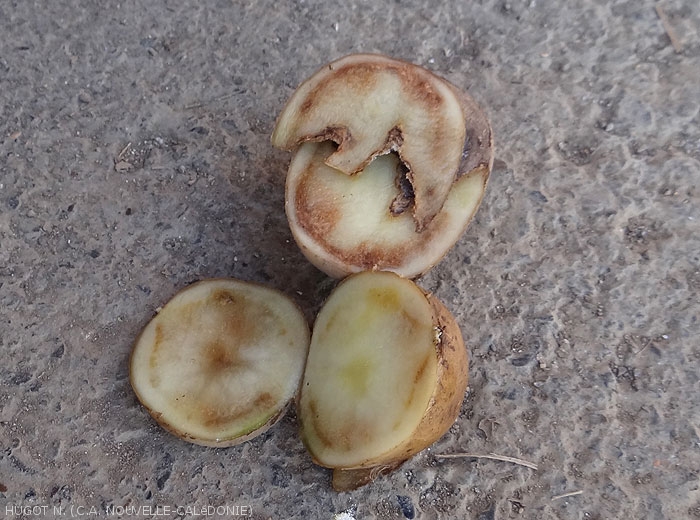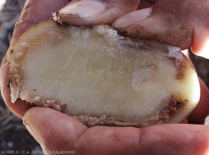 A section through the tubers reveals a reddish browning and necrosis of the vascular ring diffusing into the adjacent tissues (Figure 3), and subsequently the formation of creamy bacterial exudates (Figure 4). Exudates also visible at the level of the eyes and the areas where the stems join the tubers. Development of brown and necrotic lesions on the surface leading to their complete decomposition.