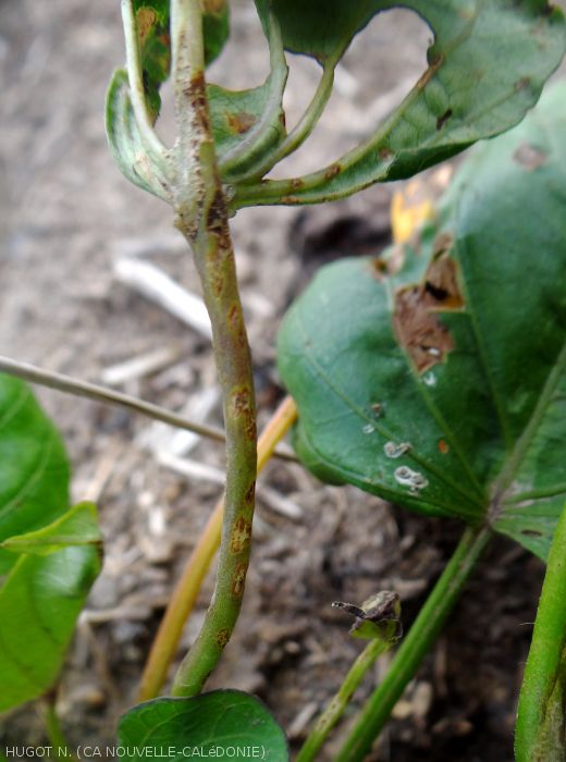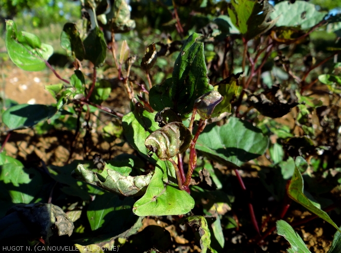 - Symptoms affecting young leaves and stems of the plant.