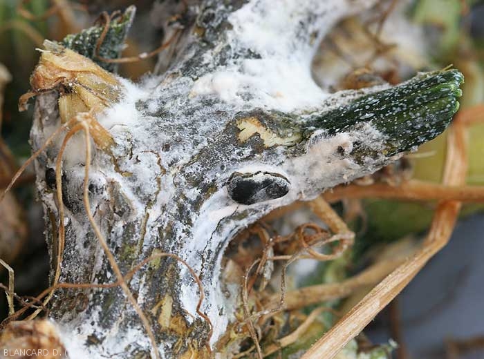 • Signs : more or less fluffy and white mycelium  on all affected tissues (figure 7), as well as large irregular black structures, sclerotia which are  rather elongated, measuring 2-20 mm x 3-7 (figures 6, 8, and 9). Small “trumpets”, apothecia, forming on the larger sclerotia.