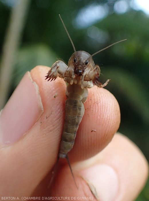 They dig galleries and move in the ground cutting the roots present in their path. The mole crickets also consume the larvae of other insects present in the soil. Occasionally they can fly to colonize the surrounding plots.