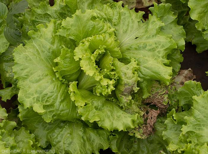 - Small chlorotic to necrotic leaf spots, presence of brown rings (figures 1 and 2-salad). The necrotic spots coalesce and lead to necrosis and drying out of the blade sector (figure 3 salad) or of entire leaves.