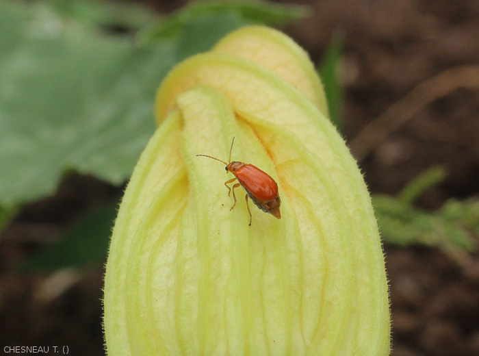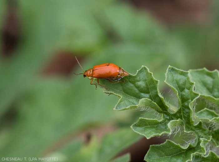 Insect present in many parts of the world (mainly in Africa and Asia) which causes extensive damage to Cucurbitaceae crops in Mayotte. Uniformly orange in color, it belongs to the Galerucinea subfamily.