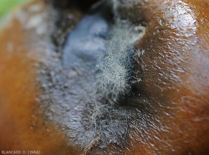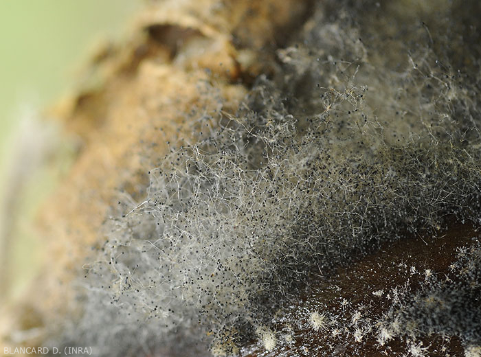 - Signs : a blackish aerial hairy mold more or less covers rotten tissue. Fruitings in the form of tiny black pin heads are visible, materializing the mycelium, but also the sporangiophores of the fungus.