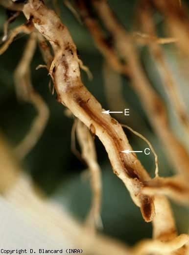 The majority of parasitic and non-parasitic diseases affecting tomato roots first cause their diffuse yellowing, then their browning (localized or generalized), and finally necrosis and the disappearance of numerous rootlets and roots. In the most severe cases, the root system is totally damaged and the vessels located at the taproot may turn yellow and brown slightly (Figure 4). The alterations sometimes evolve towards the neck and the base of the stem, causing more or less substantial cankers (see the section Various alterations of the neck and the portion of the stem close to the ground ). These symptoms can be observed both on seedlings in the nursery and on adult plants during cultivation. In the first case, they will be the cause of damping off.
