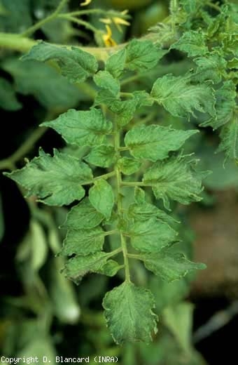 - des folioles partiellement ou totalement déformées, légèrement dentelées ou plus irrégulièrement découpées (figures 1 et 3), marbrées, cloquées et plus ou moins enroulées (figure 4) ;
