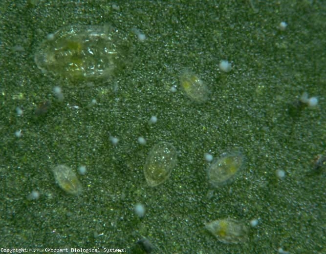 - Stages of development : the eggs (figures 4-1 and 2) (figures 5 and 6) are mainly deposited on the underside of the leaflets at the apex. White in color, they are oval and have a diameter of 0.25 mm. In the days following the laying, they turn dark. Between 7 and 10 days later, the larvae hatch (figure 4-3) ( (figures 7 and 8); these, oval and flat, measure 0.3 mm and have well-developed antennae and legs. . Losing the latter subsequently, they are immobile and feed with their rostrum. The second instar larvae are flattened, transparent and measure 0.37 mm. The third and fourth instar larvae are quite comparable (Figures 4-4 and 5 ), however with respective lengths of 0.51 and 0.73 mm. At the last larval stage, the insect secretes wax. It is when its red eyes appear that it is called puparium (figure 4-6) (figure 9). Subsequently, the whitefly develops and takes on a white tint. Adults (figure 4-7) (figures 10 and 11) have 2 pairs of wings, their size different depending on the sex: 1.1 mm for females and 0.9 mm for males Body and wings are covered with a characteristic white waxy powder. Slight morphological criteria ics (available in the table below) make it possible to differentiate the two insects. The larvae and adults, often present on the underside of the blade, feed through their rostrum which acts as a suction pump. The excess sugar in the sap is released in the form of honeydew, especially by the large larvae.