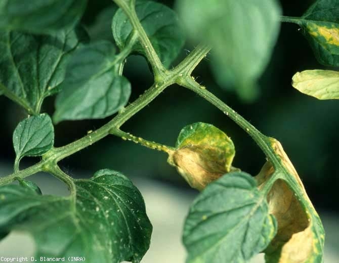 Nutritional punctures are the cause of chlorotic punctures and can distort young leaflets (Figures 4 and 5). A reduction in the growth of young shoots, or even plants, can be observed. Besides aphid colonies, often observed the white driven and the presence of honeydew on the surface of above tomato, on which develops Sooty mold (sooty mold). It should be remembered that the latter can have several consequences, in particular a reduction in photosynthesis and leaf respiration and the soiling of fruits thus rendered unmarketable.