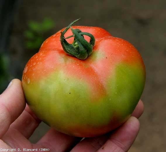 Zones vertes à jaunes plus ou moins étendues, apparaissant sur les fruits à maturité (figures 1 à 3), de consistance ferme et les rendant impropres à la commercialisation. Autrement dit, maturation partielle des fruits en taches (blotchy ripening) survenant plutôt dans la zone pédonculaire. Une coupe transversale dans les fruits permet de confirmer leur maturation partielle, ainsi que le brunissement de certains vaisseaux du péricarpe dans les zones encore vertes (brunissement interne, internal browning).